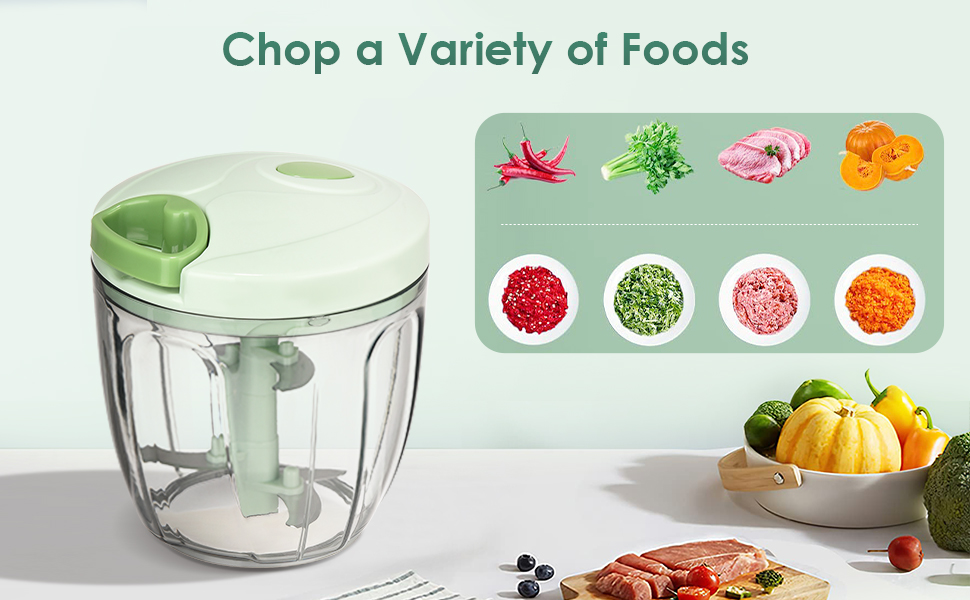 Fácil de limpiar: la picadora de alimentos se puede desarmar para facilitar la limpieza. Puedes terminar de limpiarlo rápidamente. El diseño compacto permite ahorrar espacio, ya sea en casa o al aire libre, puede colocar el picador de verduras en cualquier lugar.